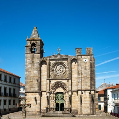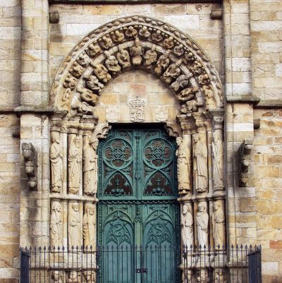 Fachada occidental: La fachada ofrece en su exterior, cara a la plaza del Tapal, una bella portada escultórica que nos lleva a ver la influencia de la obra del maestro Mateo en el Pórtico de la Gloria de la catedral de Santiago.